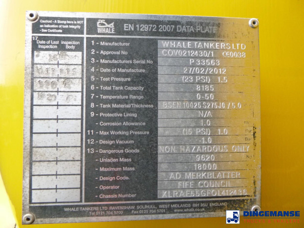 Whale steel vacuum tank (tipping), Capacity 8185 liters, Test pressure 1.5 bar, Max working pressure 1.0 bar / -1.0 bar vacuum, Tank material code BS EN 10025 S275.10/5.0, Vacuum pump, high pressure pump, Jetting hose reel, Year of construction 2012 // Truck 4x2, Adblue, Euro 5, Automatic gearbox, Diff lick, Full steel suspension, Day cabin, Digital tachograph, Shipment dimensions 750x250x385 cm