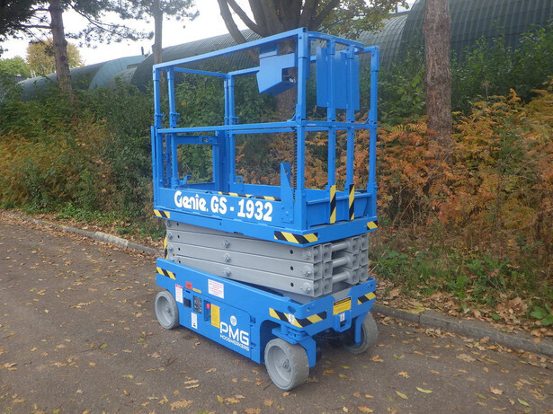 Brand: Genie Model: GS-1932 Type: Scissor lift Serial number: GS3012C-10626 Year of construction: 2012 Operating hours read: 221h Fuel: Electric battery Working height: 7.80m Lifting capacity: 227kg Machine weight: 1498kg Wheels: non-marking tires Drive: 24V