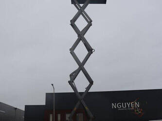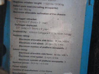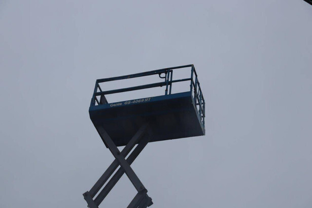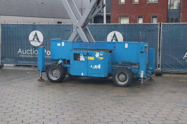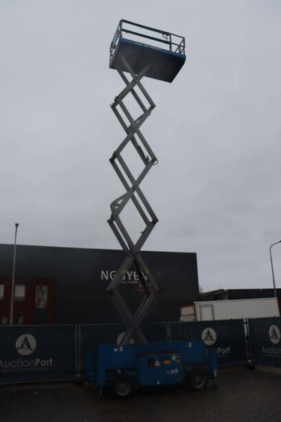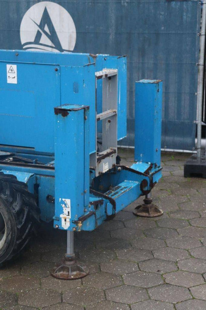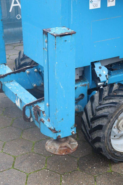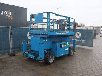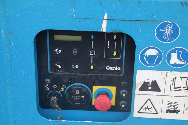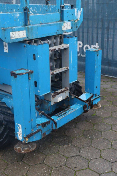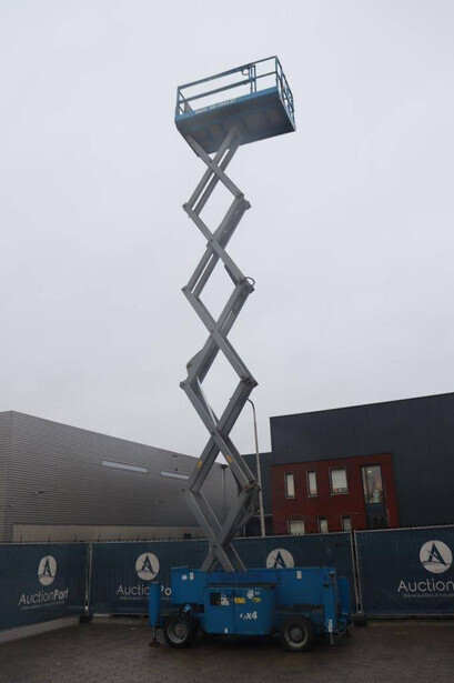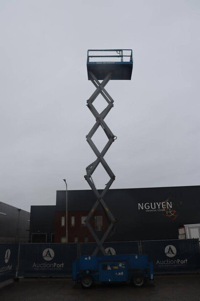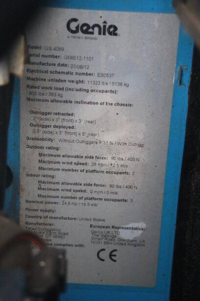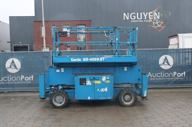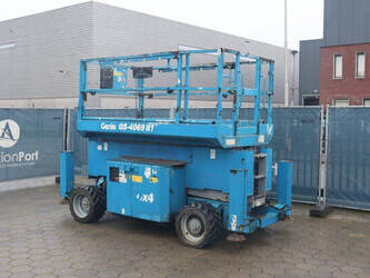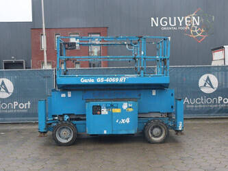 Brand: Genie Type: GS-4069 RT Serial number: GS6912-1101 Year of construction: 2012 Fuel: Diesel Lifting capacity: 363 kg Working height: 14.12 m Reading operating hours: 1807 h Machine weight: 5136 kg Chassis: Wheels Type: Scissor lift Tires: Non-marking tires Color: blue