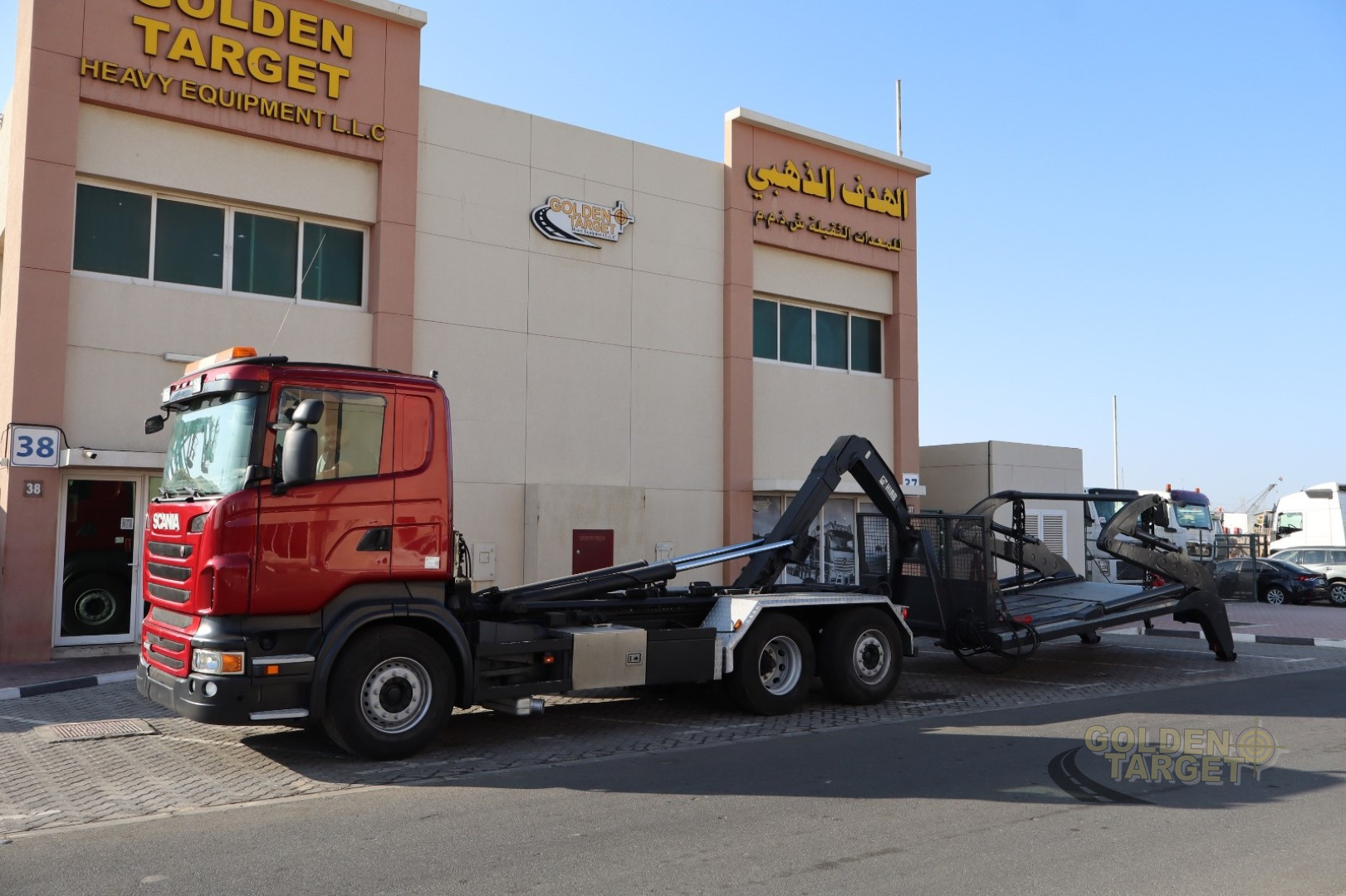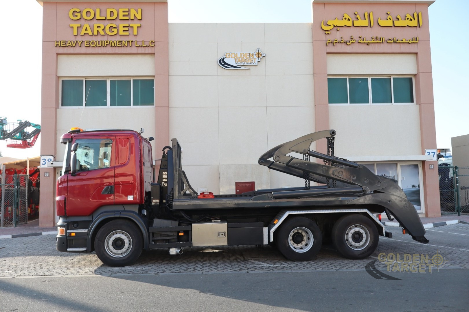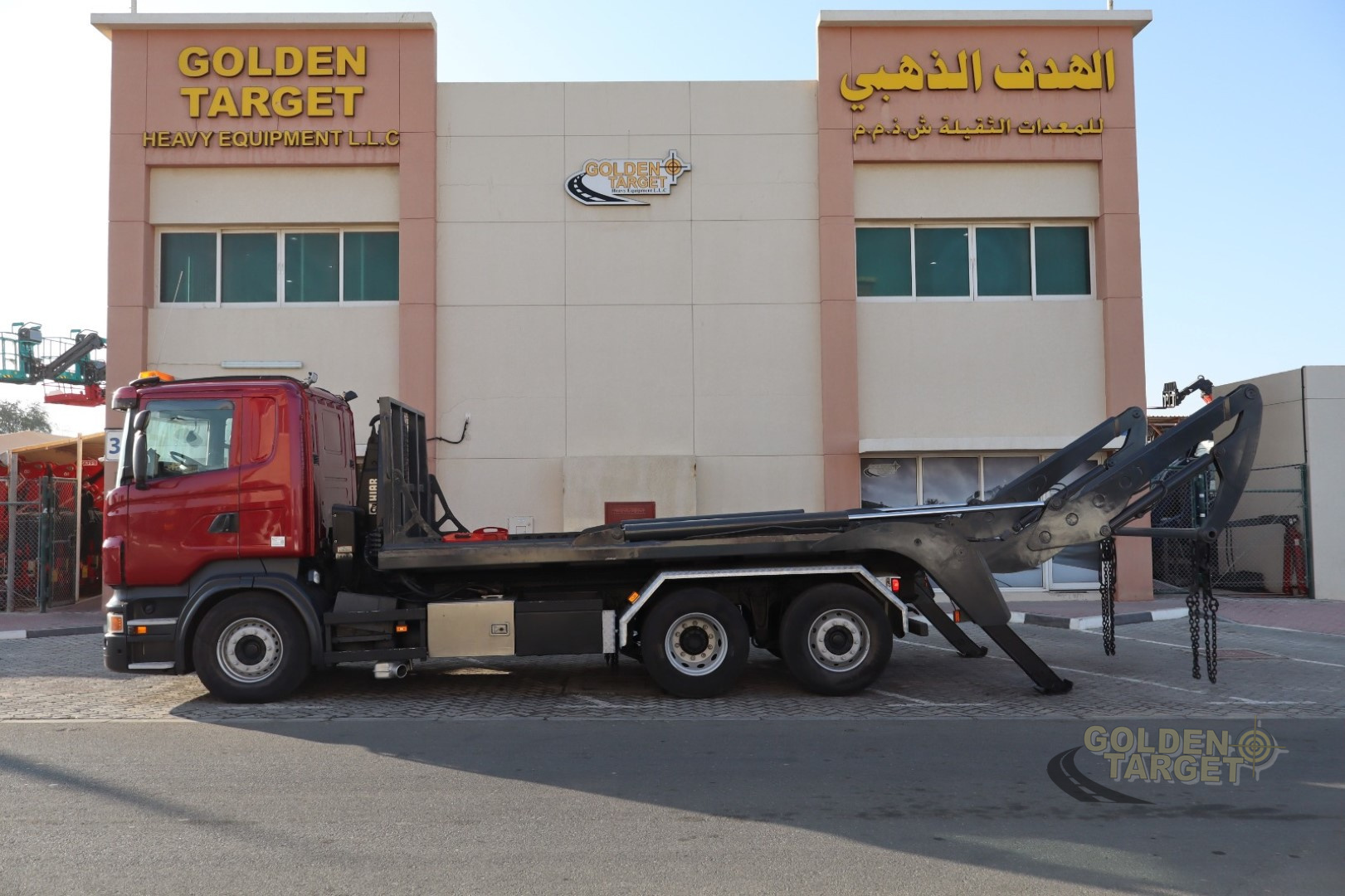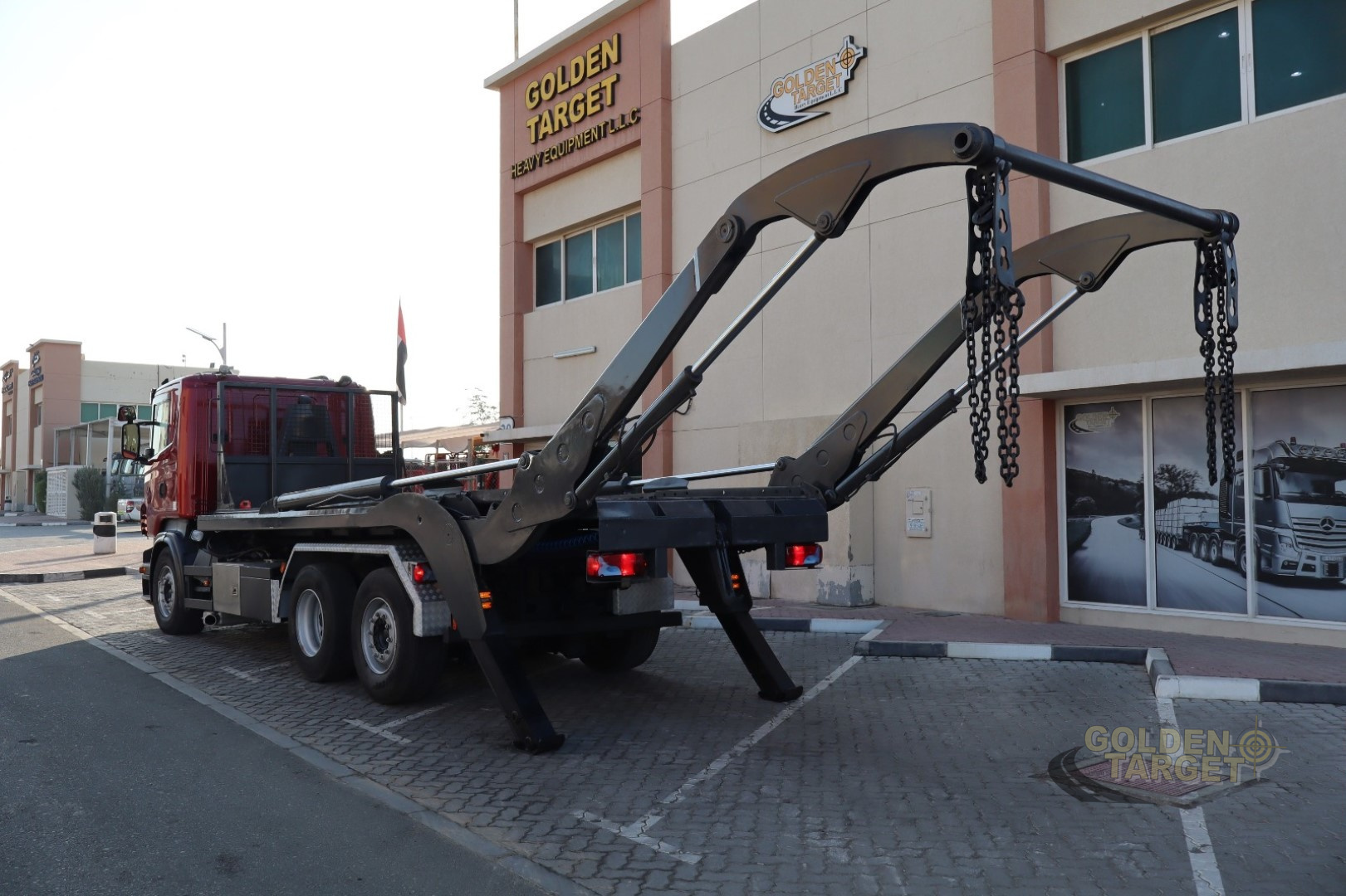 Long Chassis 6x2, Automatic Gear, 6 Cylinder, 480 HP, Front Spring System, Rear Air Suspension, HIAB Hook Lift 20T Capacity + Double Skip Loader.