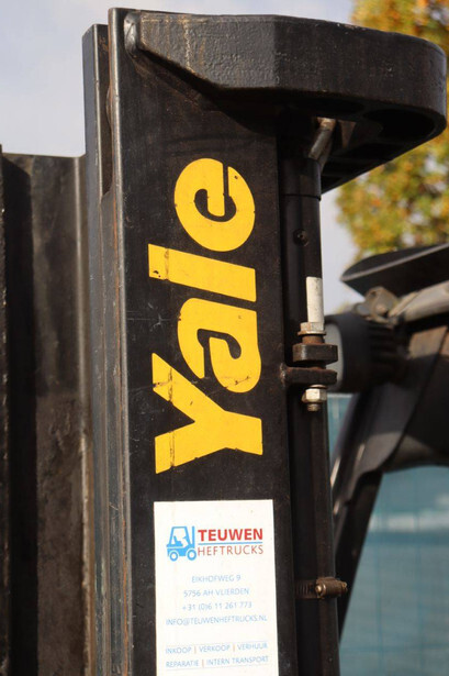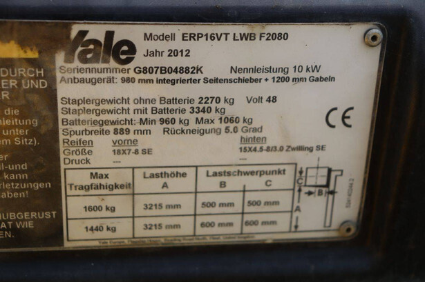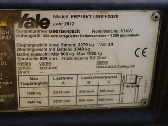 Brand: Yale Type: ERP16VT Serial number: G807B04882K Year of construction: 2012 Fuel: Electric Mast type: Duplex Sideshift: Yes Lifting capacity: 1600 kg Lifting height: 3215 mm Operating hours read: 10870 h Machine weight: 3340 kg Tires: Solid tires Color: yellow