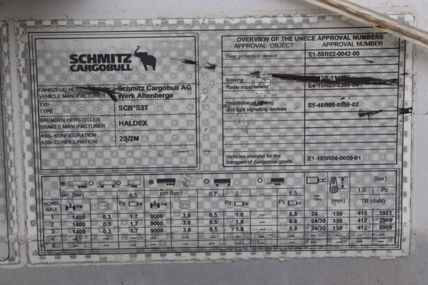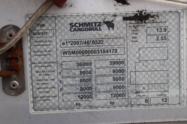 Merk: Schmitz Cargobull Type: SCB*S3T Chassisnummer: WSM00000003184172 Bouwjaar: 2013 MTM: 39000 kg Aantal assen: 3 Remmen: Trommelremmen Afmetingen: 1390 x 2550 mm
