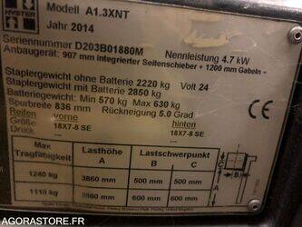 Hyster A1.3 XNT Vat: 20 Fuel: electro FR: Type de véhicule Chariot frontal 3 roues IMPORTANT: VGP Mai 2024 sans réserves Etat des pneus: Bon Charge maximale: 1240 Hauteur de travail max: 3860 Date dernier contrôle de levage: 29/05/2024 poids net à vide: 2850 TDL Chariot frontal 3 roues - Hyster A1.3 XNT TDL - Duplex Hauteur replié 2600mm Hauteur levage 3860mm 1332 heures 2850kg avec batterie Très bon état Batterie 24V 735Ah remplacée en 2021 Chargeur remplacée en 2021 VGP OK le 29/05/2024 Ref No:WK37619
