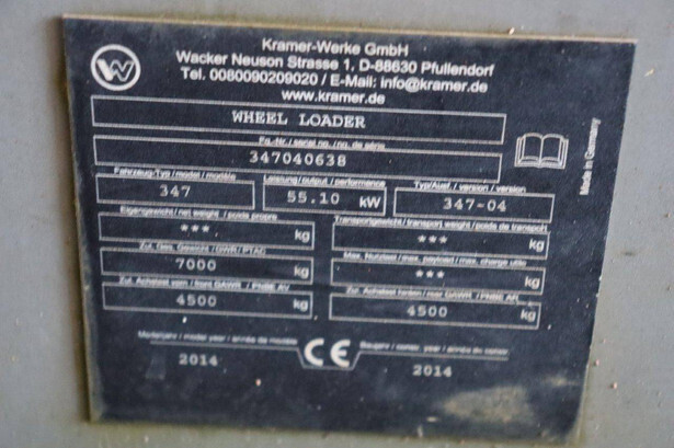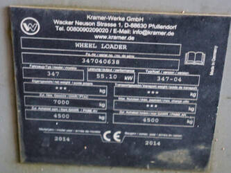 Brand: Kramer Type: 347 Serial number: 347040638 Year of construction: 2014 Fuel: Diesel Engine power: 75 HP Operating hours read: 3901 h Machine weight: 7000 kg Tires: Pneumatic tires Color: blue