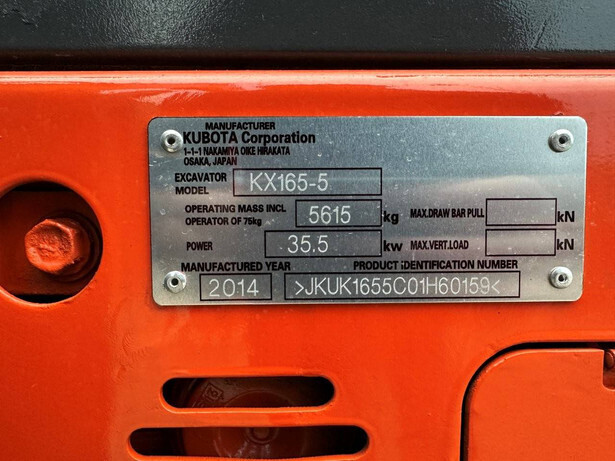 Brand: Kubota Type: KX165-5 Serial number: JKUK1655C01H60159 Year of construction: 2014 Fuel: Diesel Engine power: 35.5 kW Engine make and type: Kubota V2607