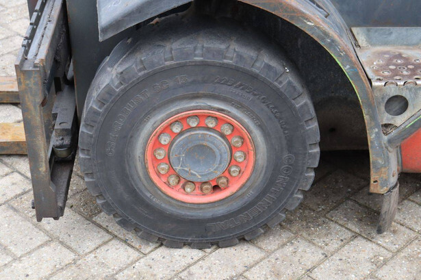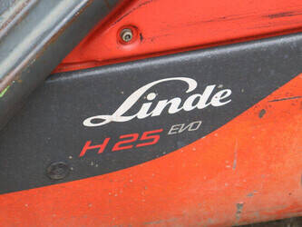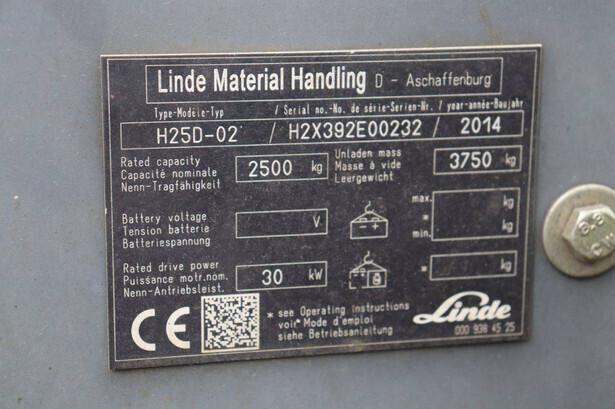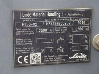 Brand: Linde Type: H25D-02 Serial number: H2X392E00232 Year of construction: 2014 Fuel: Diesel Mast type: Triplex Sideshift: Yes Lifting capacity: 2500 kg Lifting height: 7000 mm Reading operating hours: 2330 h Machine weight: 3750 kg Tires: Solid tires Color: red