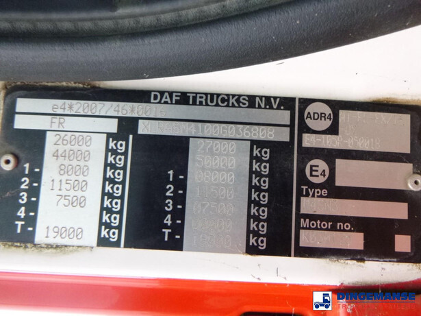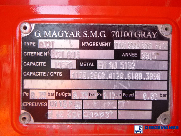 Magyar aluminium fuel tank, Capacity 19570 (netto) // 19000 (nominal), 5 Compartments 4120;2060;4120;6180;3090 // 4000;2000;4000;6000;3000, Year of construction 2015, Tank material EN AW 5182, Test pressure 0.35 bar, Working pressure 0.12 bar, Mouvex hydraulic discharge pump, Digital counter, Hose reel, Vapour recovery, Overload sensor // Truck 6x2, Euro 6, Adblue, Automatic gearbox, Diff. lock, Steel front suspension, Air rear suspension, Rockinger hitch, 3rd axle steering axle, Day cabin, Airconditioning, Digital tachograph, Shipment dimensions 900x250x330 cm