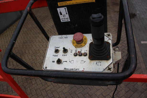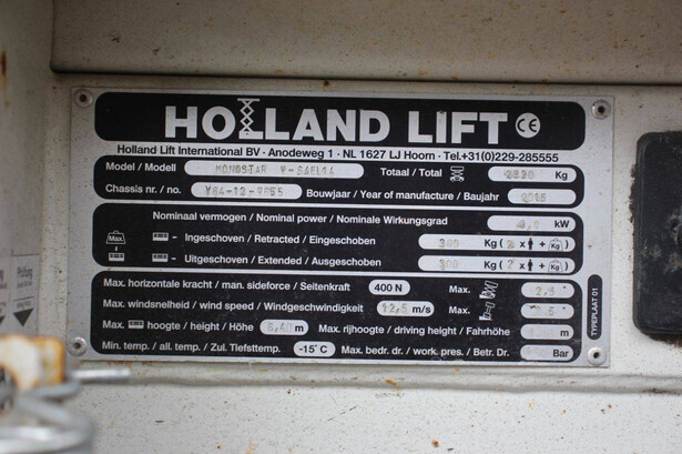 Brand: Holland Lift Type: MONOSTAR V-SAEL14 Serial number: Y64-12-7655 Year of construction: 2015 Fuel: Electric Lifting capacity: 300 kg Working height: 8.4 m Recorded operating hours: 420 h Machine weight: 2320 kg Undercarriage: Wheels Type: Scissor lift Tires: Non-marking tires Color: orange