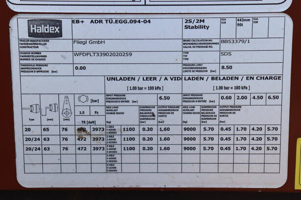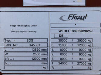 Brand: Fliegl Type: SDS Chassis number: WFDFLT33902020259 Year of construction: 2016 MTM: 35000 kg Number of axles: 3 Brakes: Disc brakes, SAF Net weight: 6270 kg Loading space volume: 101 m³ Dimensions: 13664x2484x2995 mm Tires: 385/55 R19.5