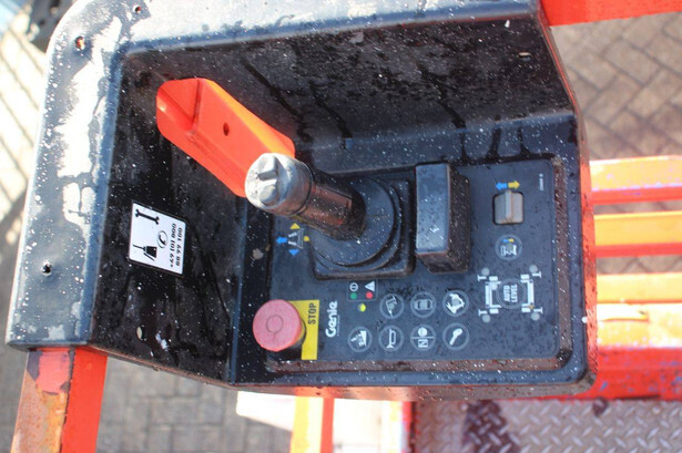 Brand: Genie Type: GS2669 RT Serial number: GS6916F-8858 Year of construction: 2016 Fuel: Diesel Lifting capacity: 680 kg Working height: 9.9 m Reading operating hours: 1556 h Machine weight: 3819 kg Chassis: Wheels Type: Scissor lift Tires: Non-marking tires Color: red