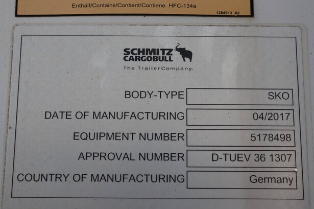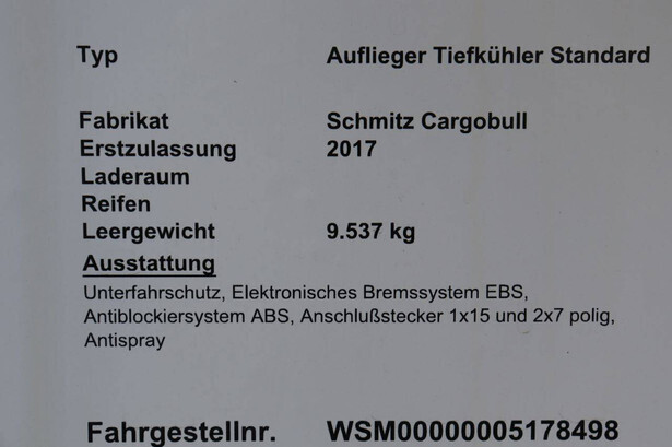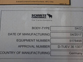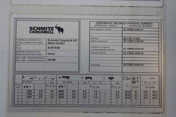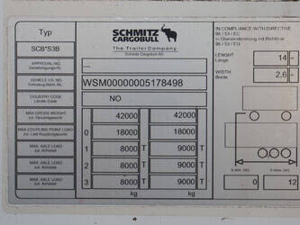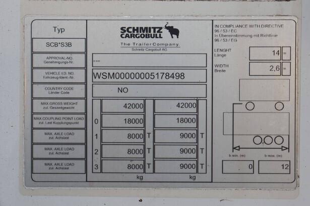 Brand: Schmitz Cargobull Type: SCB*S3B Chassis number: WSM00000005178498 Year of construction: 2017 MTM: 42000 kg Number of axles: 3 Brakes: Drum brakes Dimensions: 1400 x 260 cm