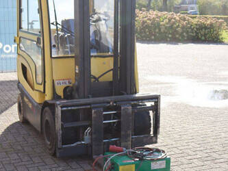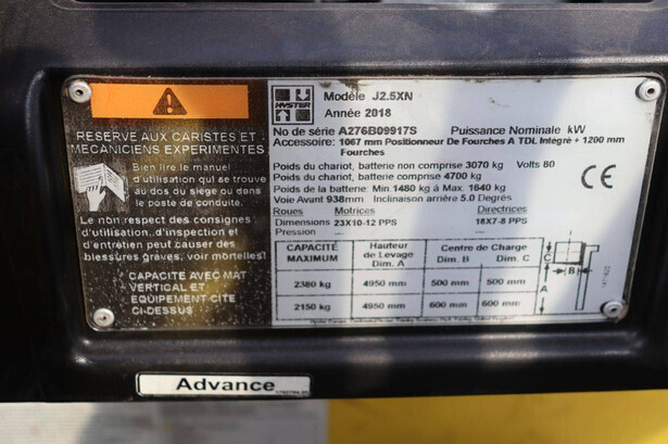 Brand: Hyster Type: J2.5XN Serial number: A276B09917S Year of construction: 2018 Fuel: Electric Mast type: Triplex Sideshift: Yes Lifting capacity: 2380 kg Lifting height: 3800 mm Operating hours read: 3014 h Machine weight: 4700 kg Tires: Solid tires Color: yellow