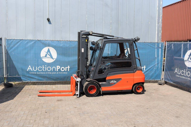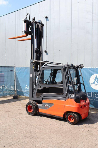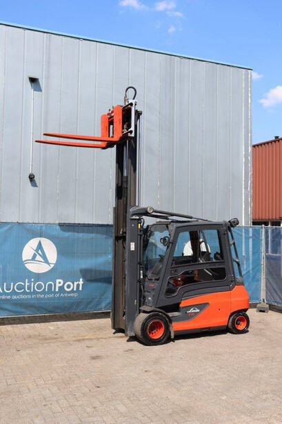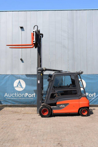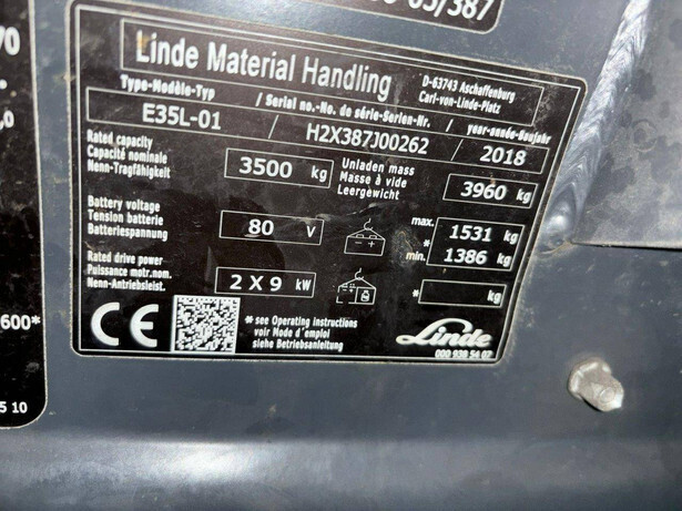 Brand: Linde Type: E35L-01 Serial number: H2X387J00262 Year of construction: 2018 Fuel: Electric Mast type: Duplex Sideshift: Yes Lifting capacity: 3500 kg Lifting height: 3100 mm Operating hours read: 13357.0 h Machine weight: Not known Tires: Solid tires Color: red