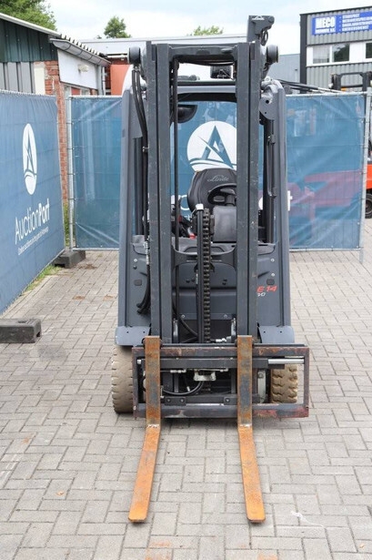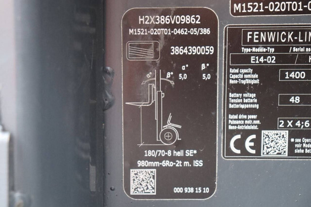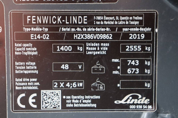 Brand: Linde Type: E14-02 Serial number: H2X386V09862 Year of construction: 2019 Fuel: Electric Mast type: Triplex Sideshift: Yes Lifting capacity: 1400 kg Lifting height: 6000 mm Reading operating hours: 5916 h Machine weight: 3300 kg Tires: Non-marking tires Color: red