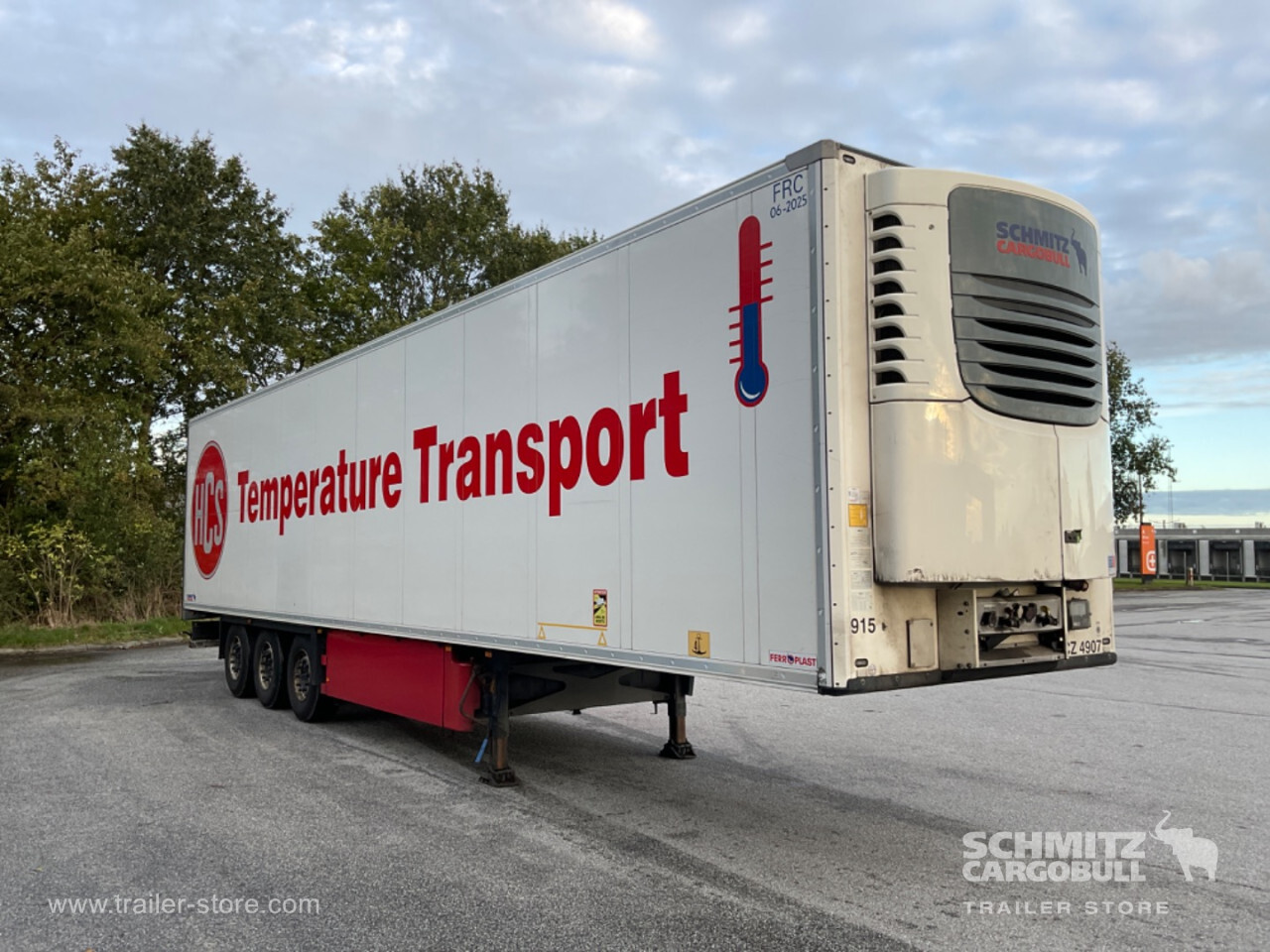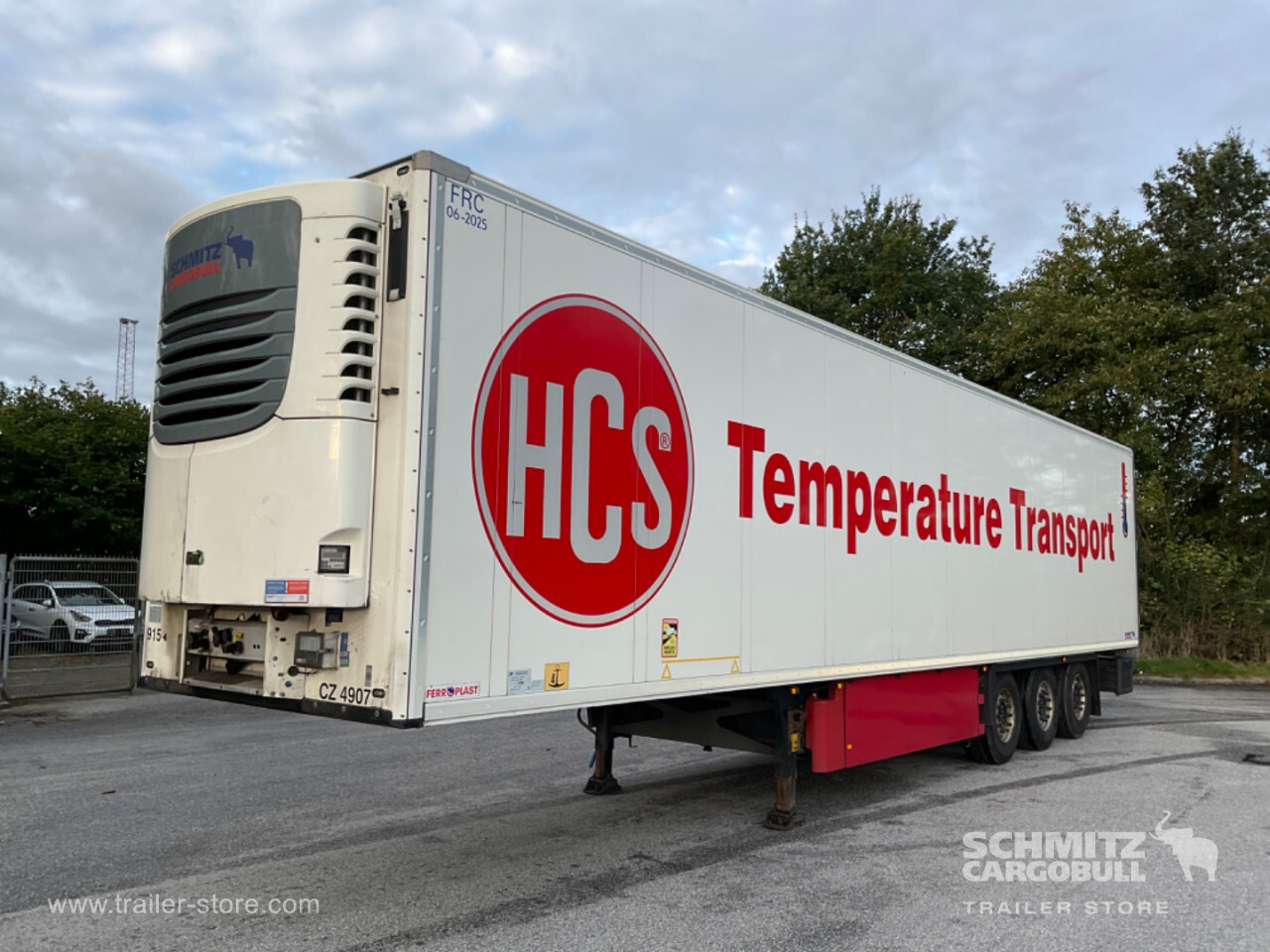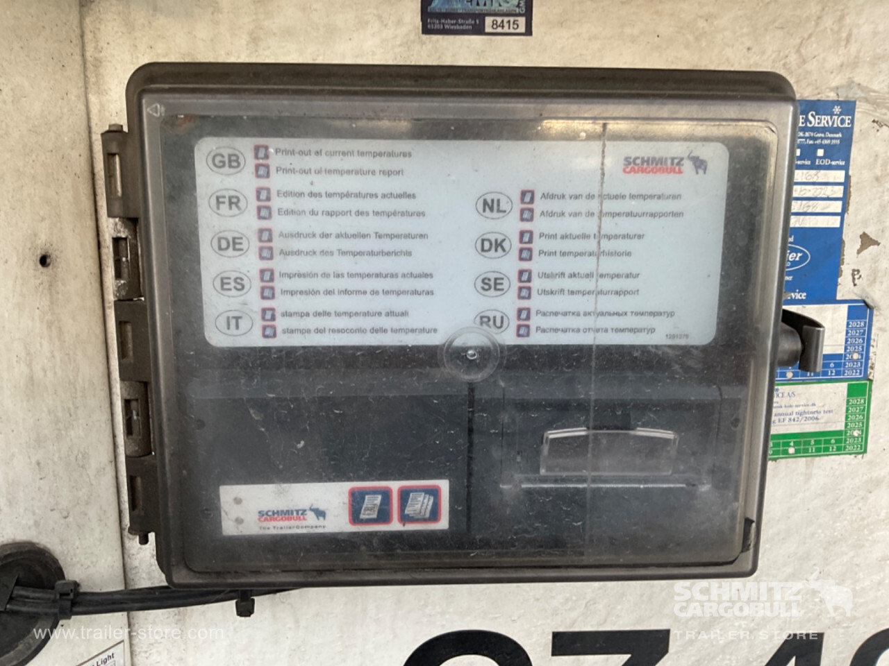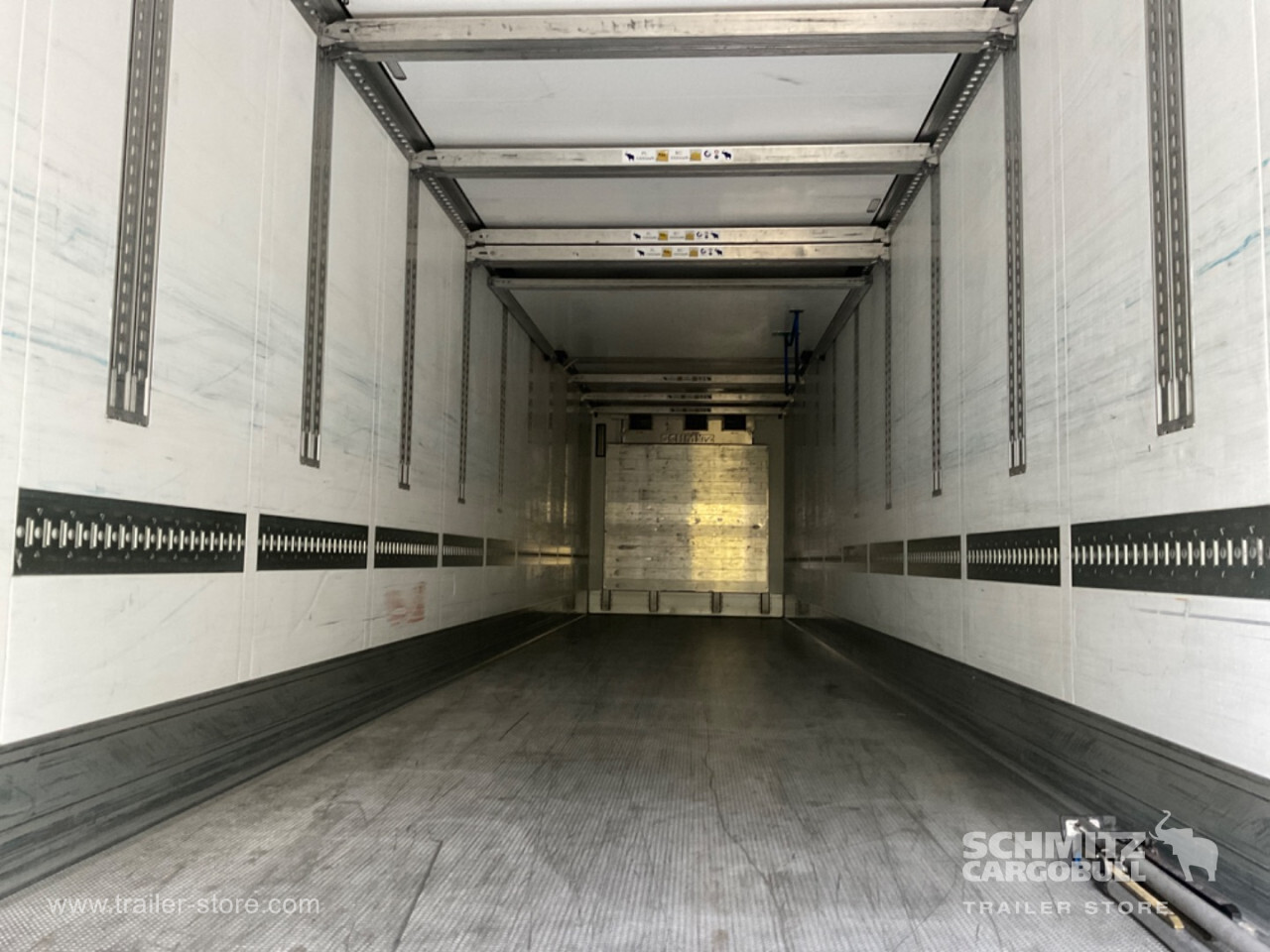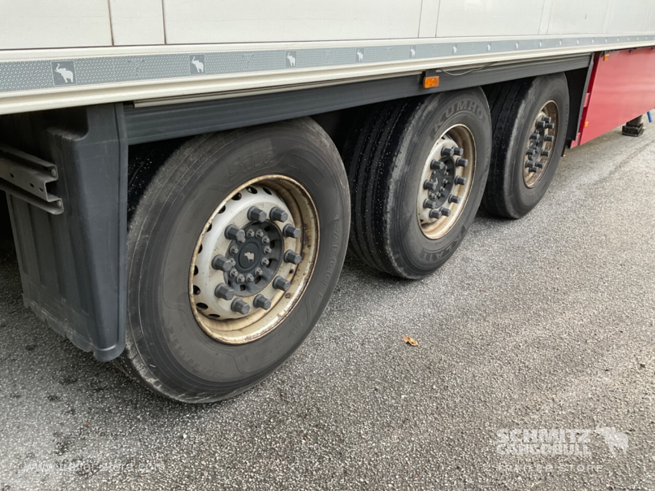 Remarks: **Safety**\\Fixed rear underrun, Antilock Braking System ABS\\\\**Interior**\\ISO partition wall without ventilators, Double deck with beams\\\\**Exterior**\\Air suspension, Pallet box (double), Ferry lashings, 1x15 and 2x7 pin plug, Antispray, Customs sealing capability\\\\**Brake system**\\Disc brake, Schmitz ROTOS\\\\**Floor**\\Aluminum floor\\\\**Cooling unit**\\Schmitz Cargobull, Diesel/Elektro, 15.456 Operating hours Diesel, 408 Operating hours electric\\\\**Loading area**\\Length 13.403 mm, Width 2.490 mm, Height 2.700 mm, Volume 90 m³\\\\**Tyre sizes**\\ 385/65 R22.5 , 385/65 R22.5 , 385/65 R22.5\\\\----