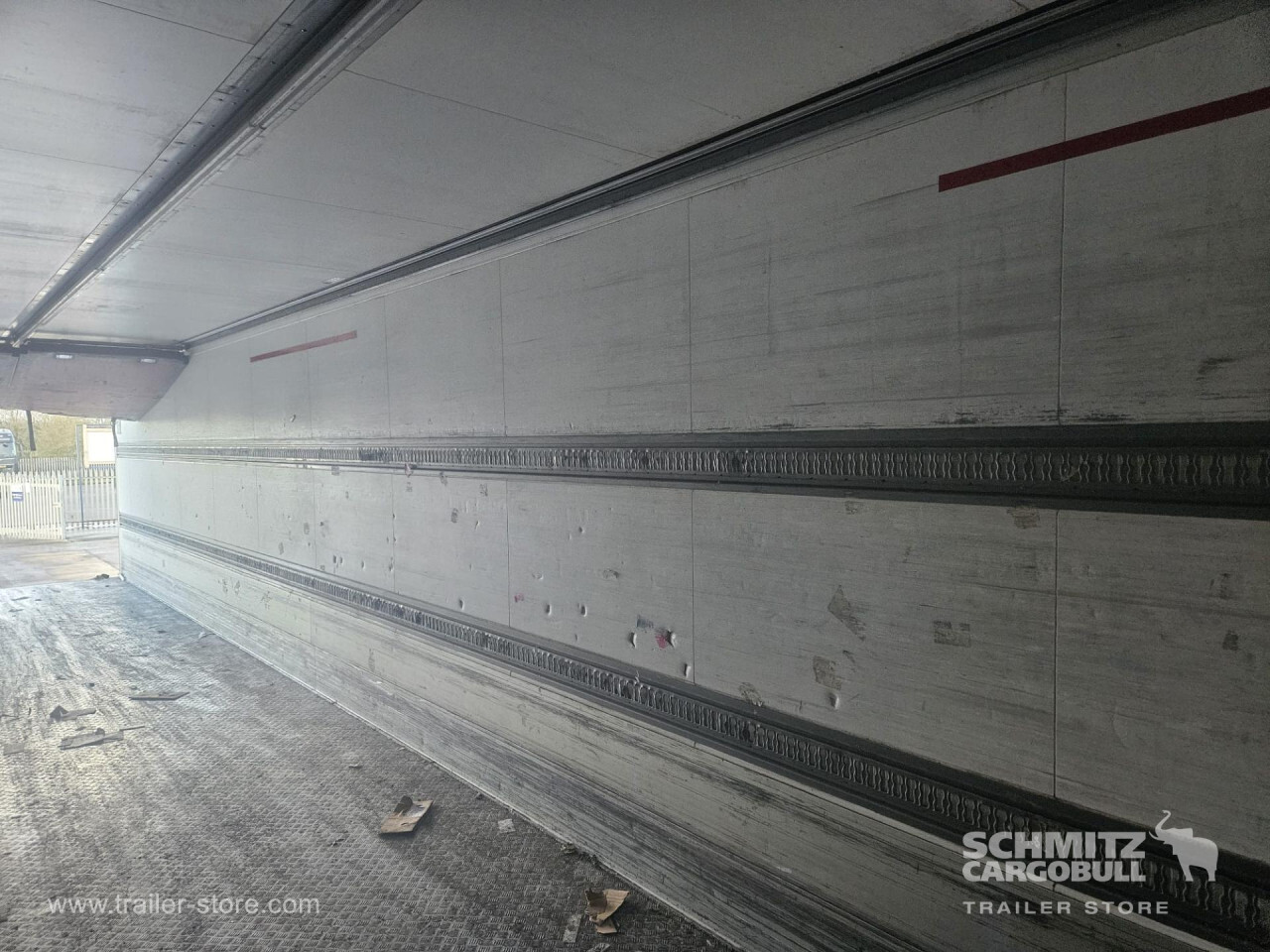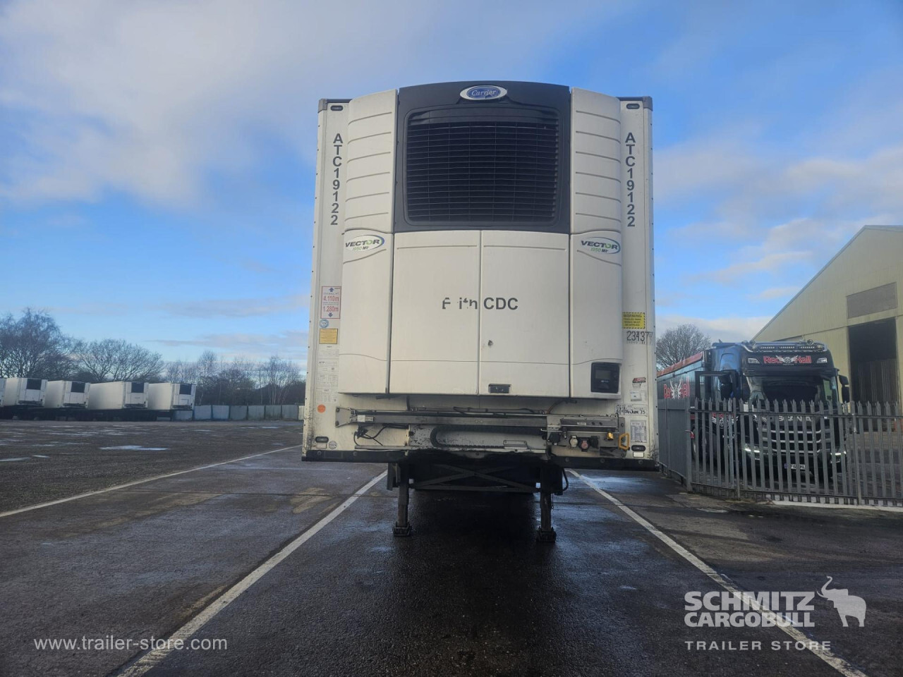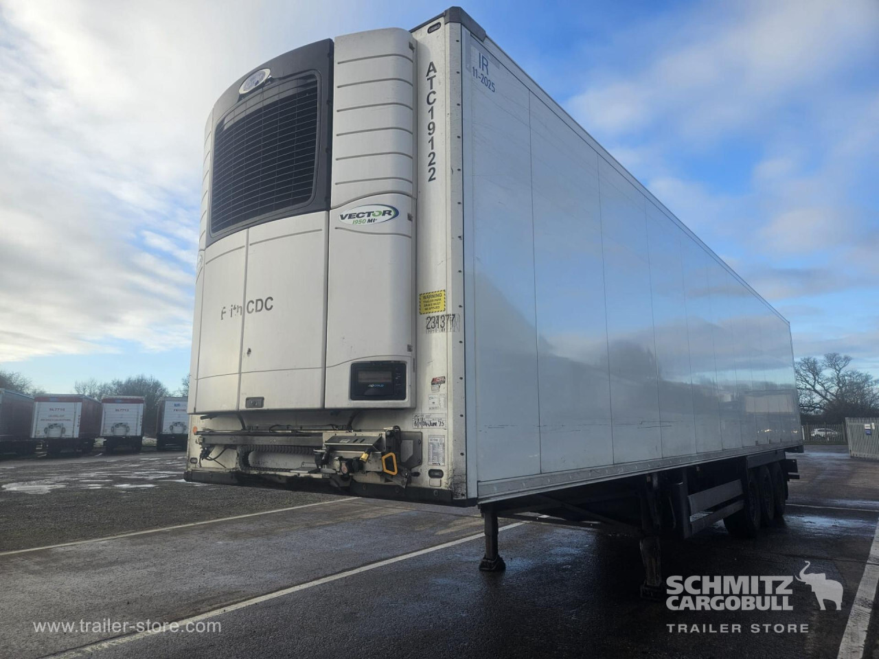 Remarks: **Safety**\\Rear underrun, Antilock Braking System ABS\\\\**Exterior**\\Air suspension, Toolbox, Ferry lashings, 1x15 and 2x7 pin plug, Antispray\\\\**Further equipment**\\2 LED reverse (Banksman) lights on rear.5 Bar tread plate floor.Pair of V7 load securing rails.LED side marker lights coupled with indicators.Ultra bright interior lighting without rotary switch.\\\\**Cargo securing**\\Load securing rail\\\\**Brake system**\\Disc brake, Schmitz ROTOS\\\\**Floor**\\Aluminum floor\\\\**Cooling unit**\\Carrier Vector 1950 MT, Diesel/Elektro, 6.685 Operating hours Diesel, 431 Operating hours electric\\\\**Loading area**\\Length 13.403 mm, Width 2.490 mm, Height 2.600 mm, Volume 86 m³\\\\**Tyre sizes**\\ 385/65 R22.5 , 385/65 R22.5 , 385/65 R22.5\\\\**Other dimensions and weights**\\Payload: 30.424 kg, GVW: 39.000 kg, Wheel base: 7.600 mm\\\\----