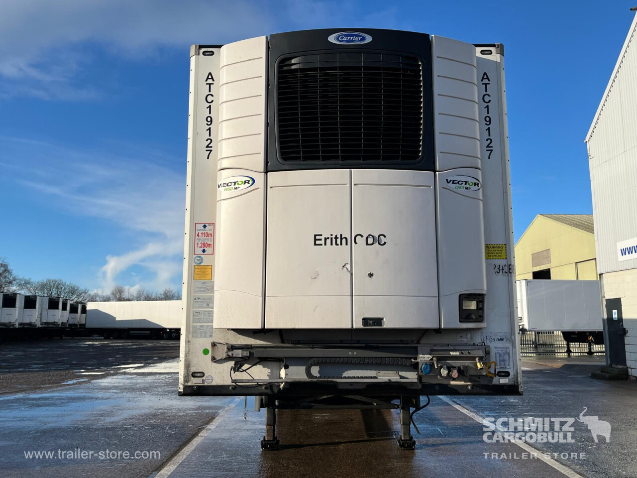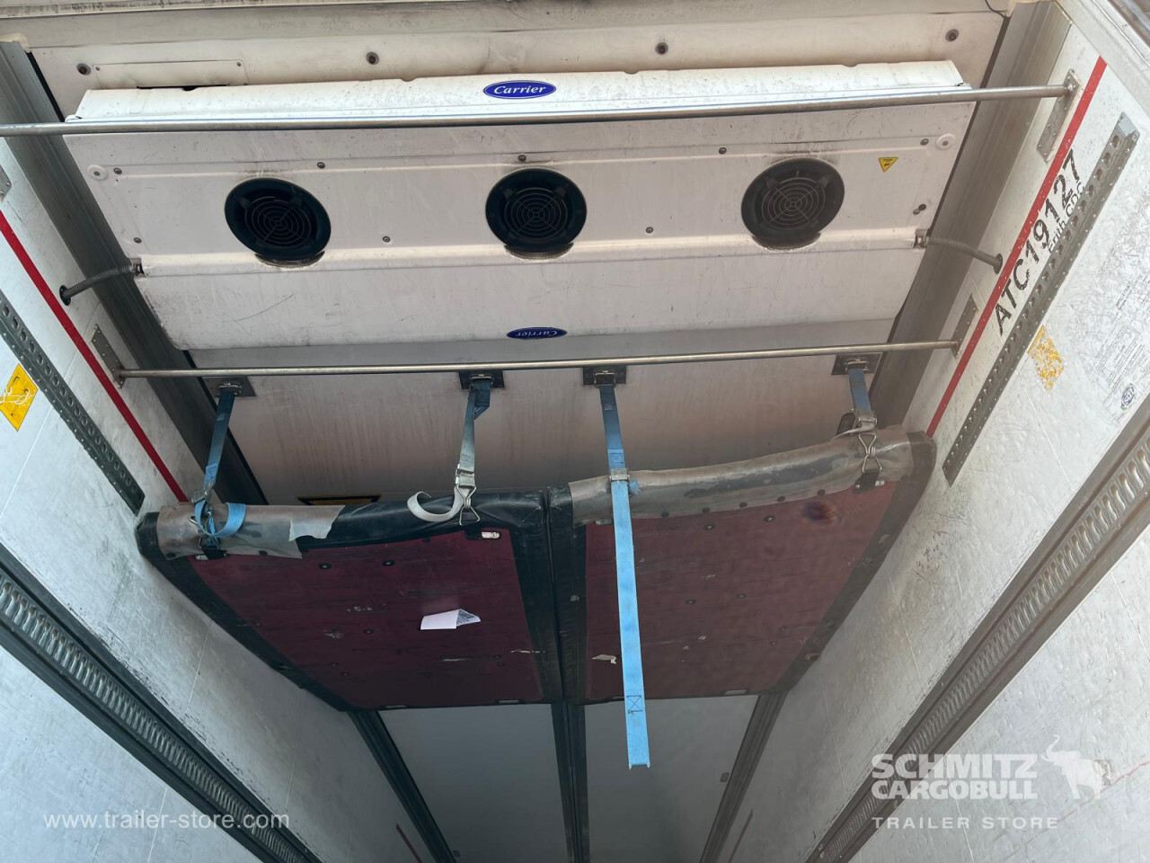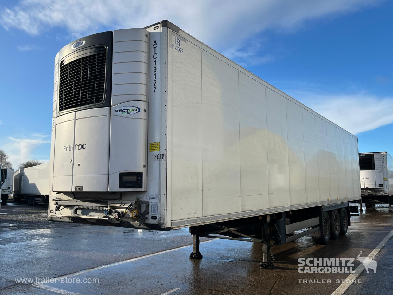 Remarks: **Safety**\\Rear underrun, Antilock Braking System ABS\\\\**Exterior**\\Air suspension, Toolbox, Ferry lashings, 1x15 and 2x7 pin plug, Antispray\\\\**Further equipment**\\2 LED reverse (Banksman) lights on rear.5 Bar tread plate floor.Pair of V7 load securing rails.LED side marker lights coupled with indicators.Ultra bright interior lighting without rotary switch.\\\\**Cargo securing**\\Load securing rail\\\\**Brake system**\\Disc brake, Schmitz ROTOS\\\\**Floor**\\Aluminum floor\\\\**Cooling unit**\\Carrier Vector 1950 MT, Diesel/Elektro, 7.013 Operating hours Diesel, 458 Operating hours electric\\\\**Loading area**\\Length 13.403 mm, Width 2.490 mm, Height 2.600 mm, Volume 86 m³\\\\**Tyre sizes**\\ 385/65 R22.5 , 385/65 R22.5 , 385/65 R22.5\\\\**Other dimensions and weights**\\Payload: 30.424 kg, GVW: 39.000 kg, Wheel base: 7.600 mm\\\\----