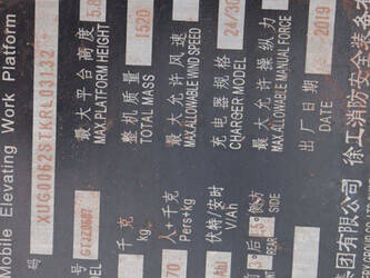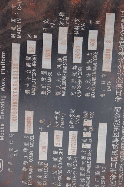 Brand: XCMG Type: GTJZ0607 Serial number: XUG0062STKRL03132 Year of construction: 2019 Fuel: Electric Lifting capacity: 230 kg Working height: 7.8 m Reading operating hours: 95 h Machine weight: 1520 kg Chassis: Wheels Type: Scissor lift Tires: Non-marking tires Color: yellow
