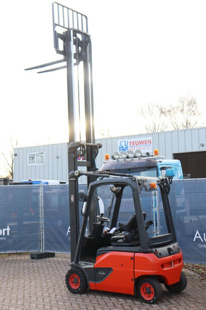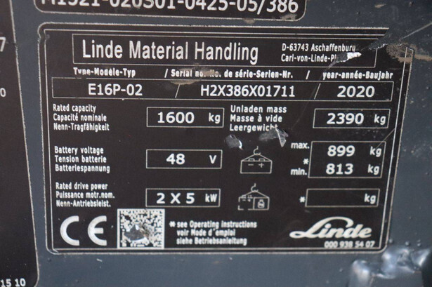Brand: Linde Type: E16P-02 Serial number: H2X386X01711 Year of construction: 2020 Fuel: Electric Mast type: Duplex Sideshift: No Lifting capacity: 1600 kg Operating hours read: 3141 h Machine weight: 3289 kg Tires: Solid tires Color: red