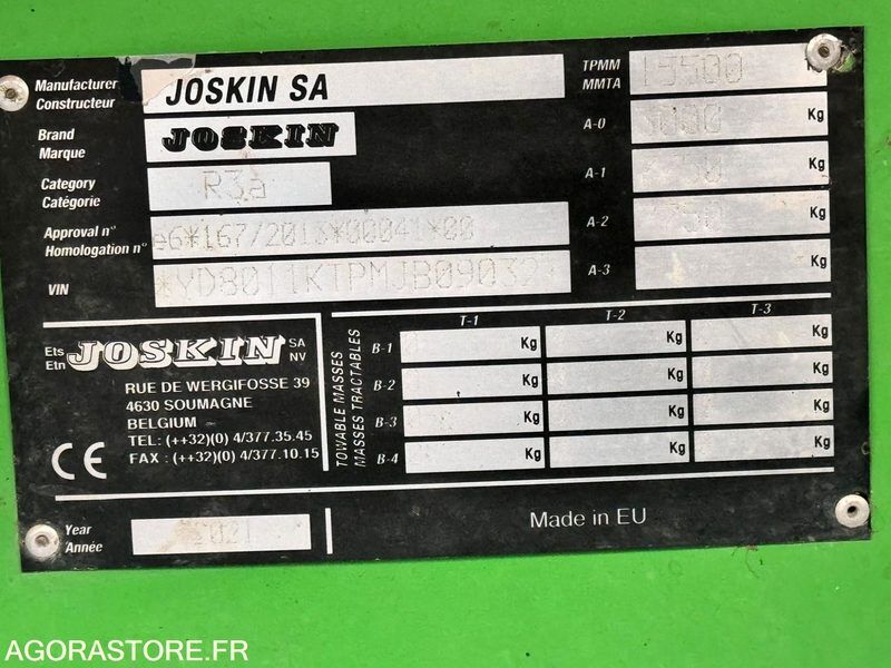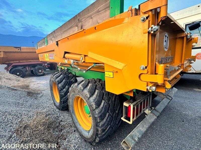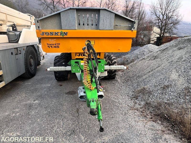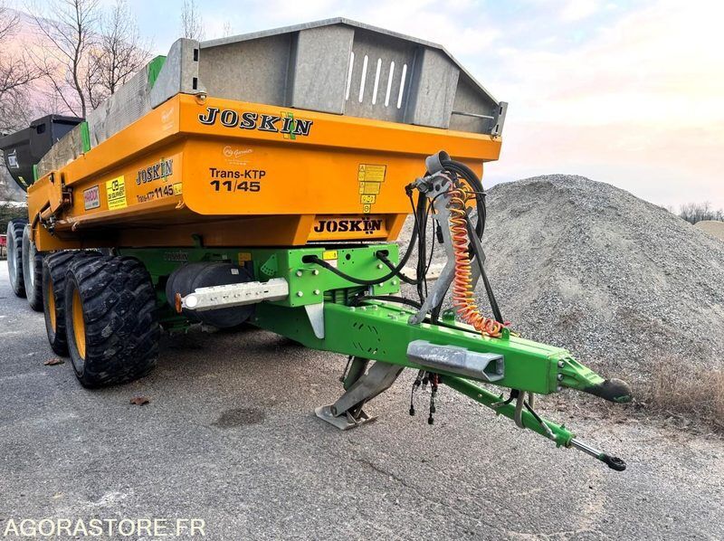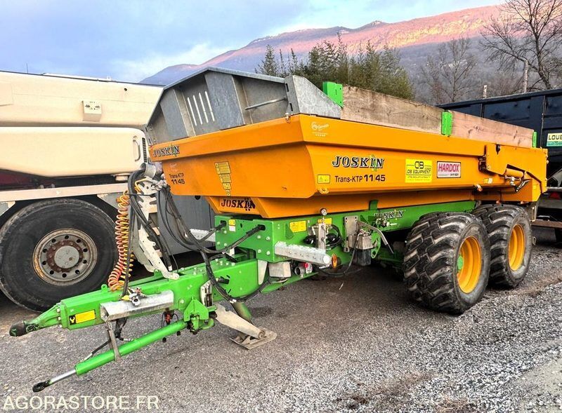 Joskin Trans-KTP 11/45 Weight: 3000 Axle number: 2 Axle 1 common tyre size: 560/45R22.5 Overall length: 4.6 Overall width: 2.3 FR: Etat général: TRES BON ETAT IMPORTANT: VENTE EN L'ETAT Type de matériel: Remorque agricole 2essieux 11T Remorque agricole 2essieux 11T JOSKIN Trans-KTP 11/45 N° de série : YD3011KTPM1B09072 Capacité de chargement 11T Volume 5,10m³ (hors réhausses) Fond et coté 4mm en Hardox 450 Béquet frontale galvanisé Réhausses latérales Porte arrière hydraulique à double partie Boggie Roll-Over à table boulonnée (débattement jusque 24 cm) Suspensions lames paraboliques Freins pneumatiques à tambours Pneumatiques 560/45R22.5 Dimensions : L 4,60m x l 2,30m Ref No:414181
