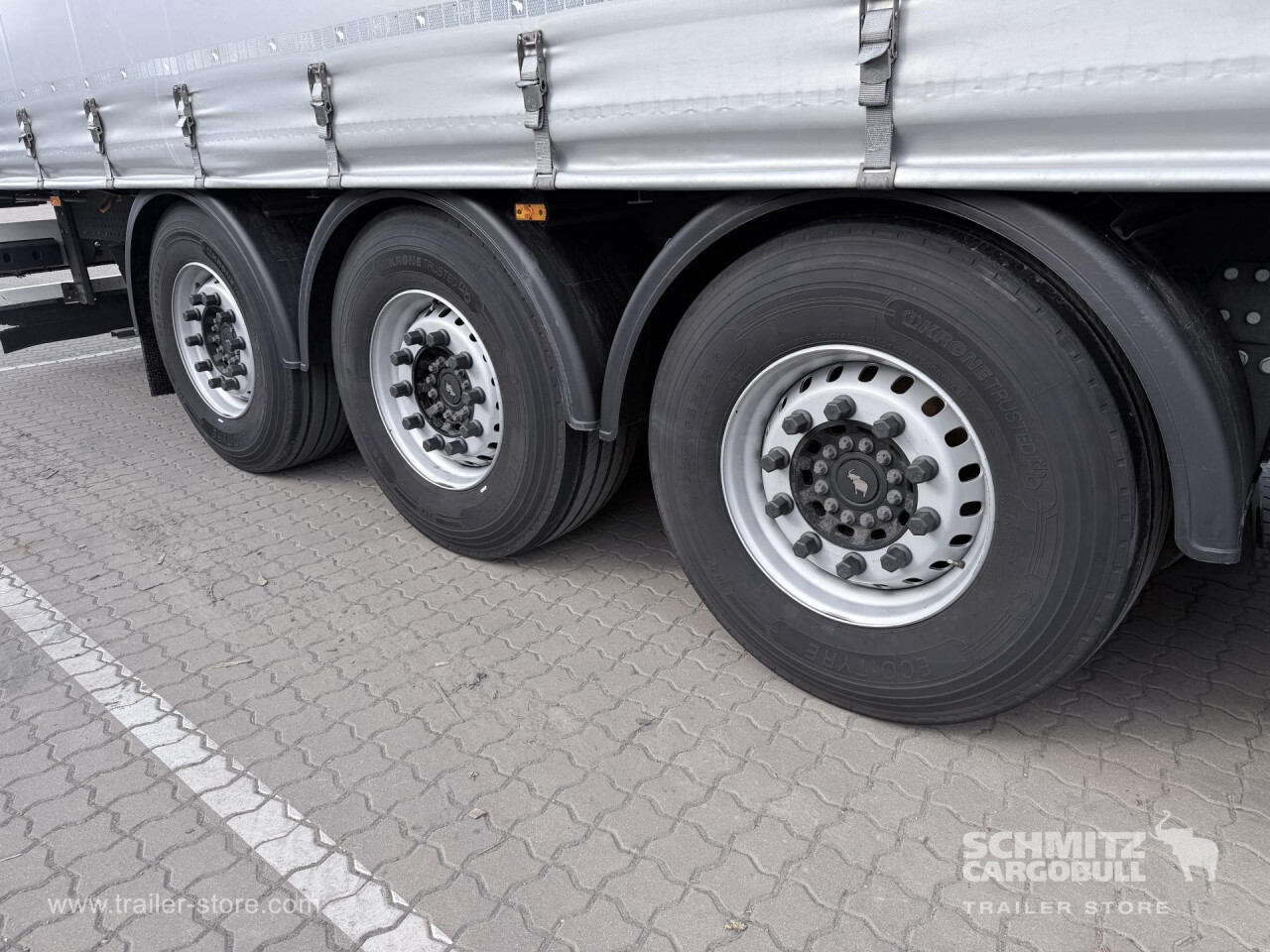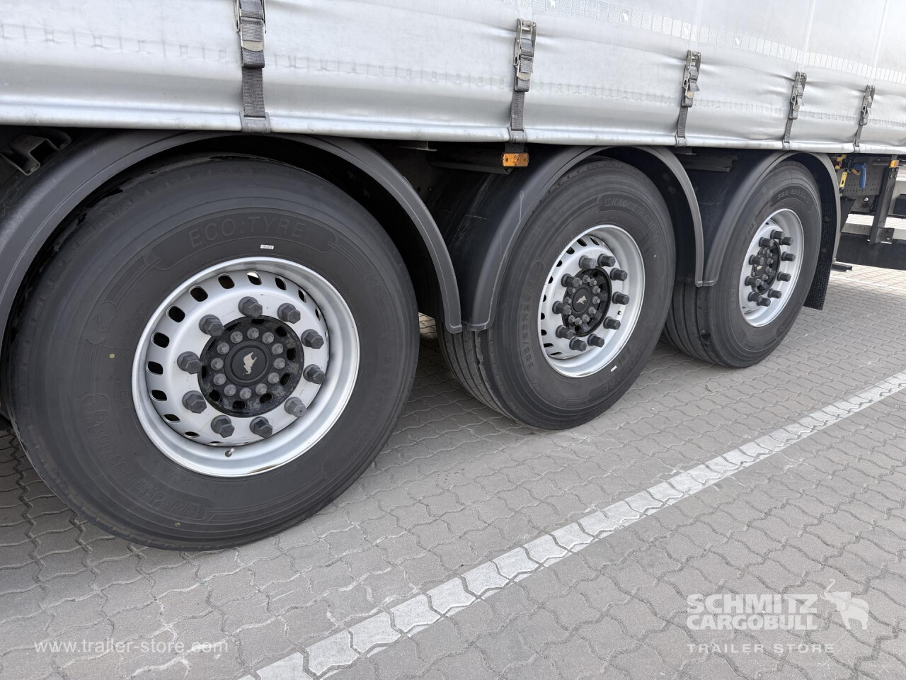 **Safety**\\Rear underrun, Antilock Braking System ABS\\\\**Exterior**\\Air suspension, Lift axle, Pallet box, Spare wheel carrier, 1x15 and 2x7 pin plug, Antispray\\\\**Brake system**\\Disc brake, Schmitz ROTOS\\\\**Tyre sizes**\\1. Achse: 385/65 R22.5 , Tread depth: 14 mm / 14 mm, 2. Achse: 385/65 R22.5 , Tread depth: 14 mm / 14 mm, 3. Achse: 385/65 R22.5 , Tread depth: 14 mm / 14 mm\\\\----