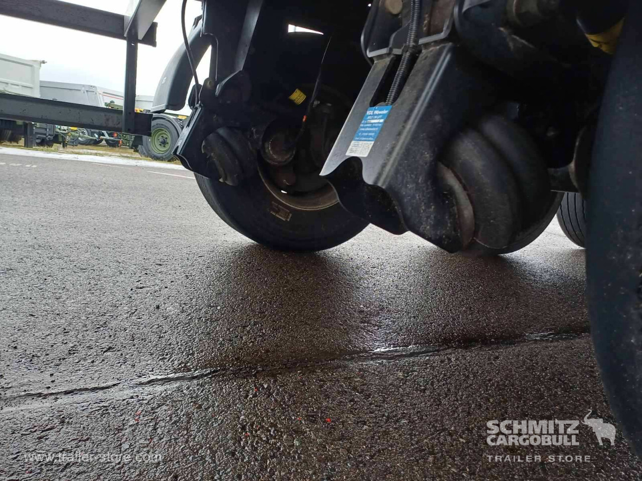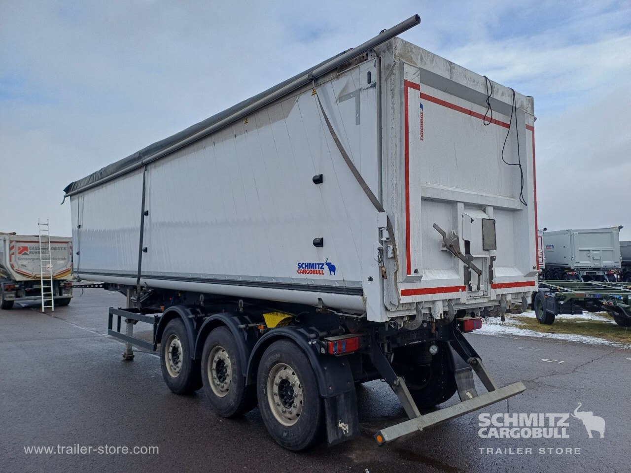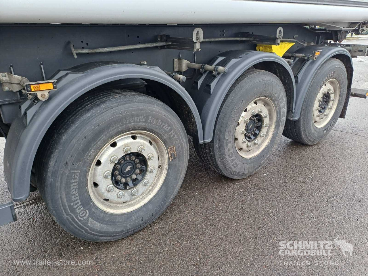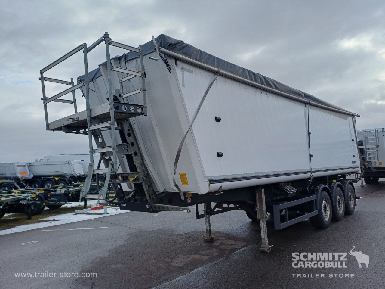Remarks: **Safety**\\Hinged rear underrun, Antilock Braking System ABS, Brake wear indicator\\\\**Exterior**\\Air suspension, Lift axle front, Exterior pendulum tailgate, Grain chute, Roof rolling tarpaulin, Access platform, 1x15 and 2x7 pin plug, Antispray, Light alloy rims\\\\**Brake system**\\Disc brake, Schmitz ROTOS\\\\**Loading area**\\Length 9.807 mm, Width 2.440 mm, Height 2.200 mm, Volume 52 m³\\\\**Tyre sizes**\\1. Achse: 385/65 R22.5 , Tread depth: 7 mm / 7 mm, 2. Achse: 385/65 R22.5 , Tread depth: 12 mm / 11 mm, 3. Achse: 385/65 R22.5 , Tread depth: 9 mm / 10 mm\\\\**Other dimensions and weights**\\GVW: 36.000 kg\\\\----