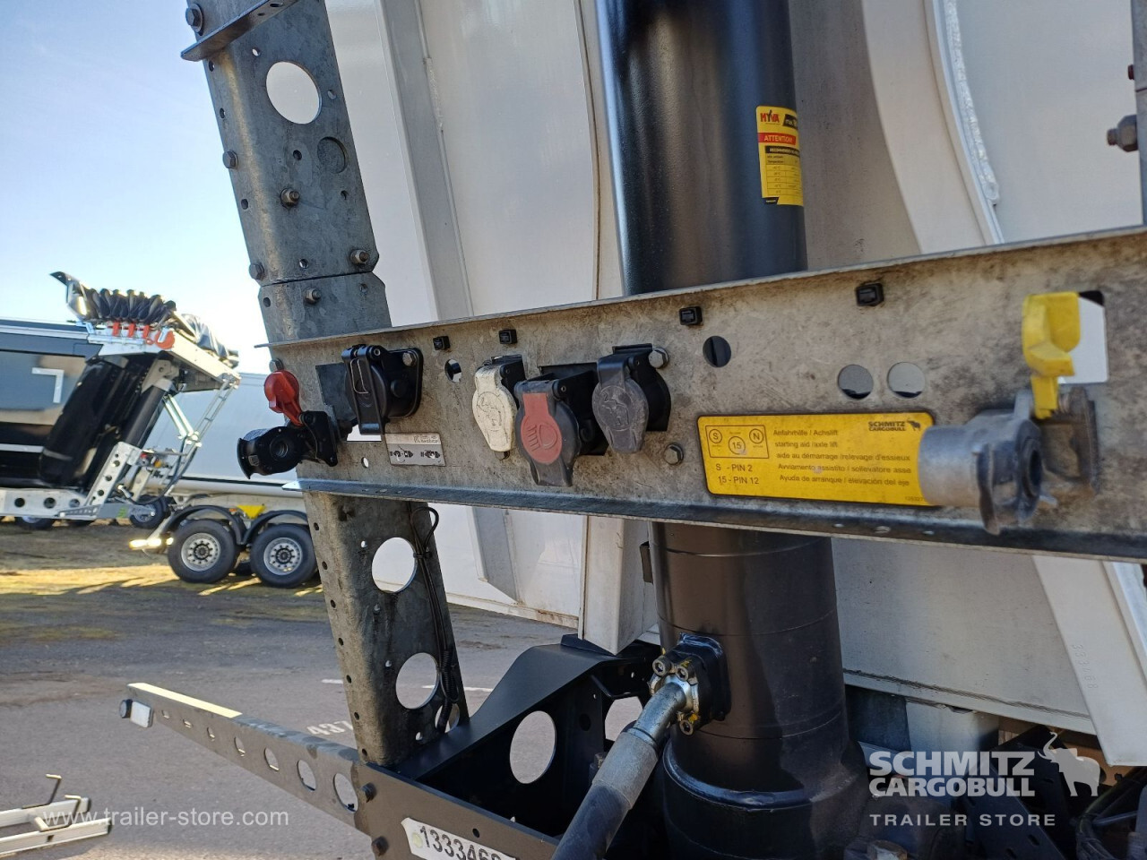 Remarks: **Safety**\\Hinged rear underrun, Antilock Braking System ABS, Brake wear indicator\\\\**Exterior**\\Air suspension, Lift axle front, Exterior pendulum tailgate, Grain chute, Roof rolling tarpaulin, Access platform, 1x15 and 2x7 pin plug, Antispray, Light alloy rims\\\\**Brake system**\\Disc brake, Schmitz ROTOS\\\\**Loading area**\\Length 9.807 mm, Width 2.440 mm, Height 2.200 mm, Volume 52 m³\\\\**Tyre sizes**\\1. Achse: 385/65 R22.5 , Tread depth: 8 mm / 11 mm, 2. Achse: 385/65 R22.5 , Tread depth: 14 mm / 11 mm, 3. Achse: 385/65 R22.5 , Tread depth: 12 mm / 7 mm\\\\**Other dimensions and weights**\\GVW: 36.000 kg\\\\----