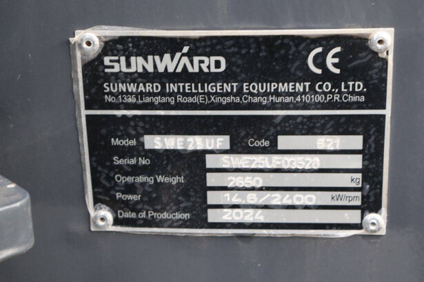Brand: Sunward Type: SWE 25UF Serial number: SWE25UF03528 Year of construction: 2024 Fuel: Diesel Engine power: 14.6 kW Quick change: Yes Reading operating hours: 7 h Machine weight: 2650 kg Running gear: Tracks Color: green