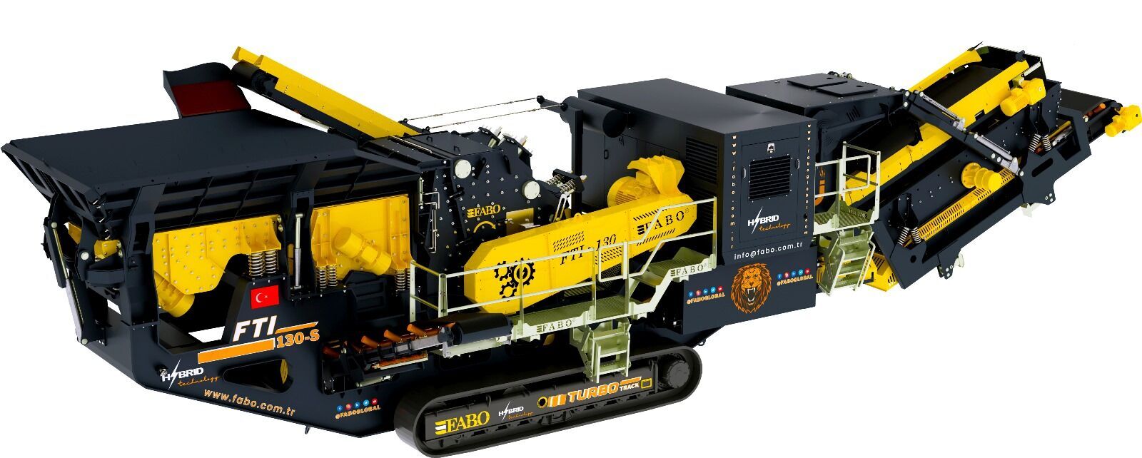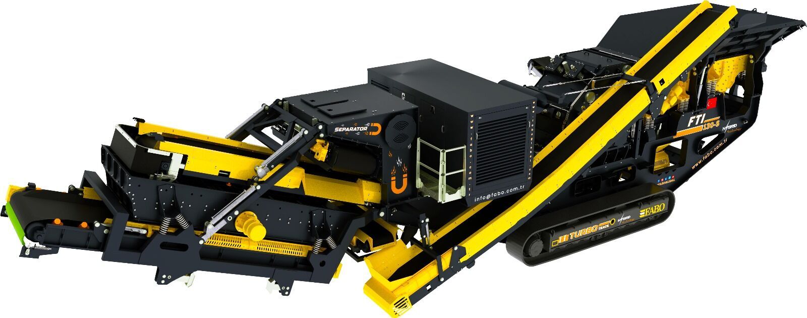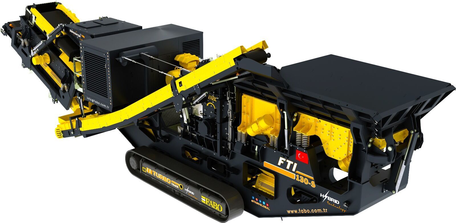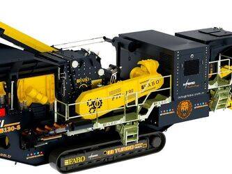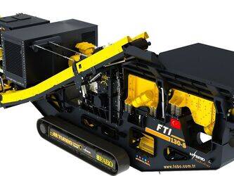 Fabo tracked impact crusher FTI-130s is a complete mobile system which moves on hydraulicly driven tracked system with 1 km/h speed and combination of a vibrated grizzly feeder, an Impact crusher, foldable stockpile conveyors, control unit and electric generator.