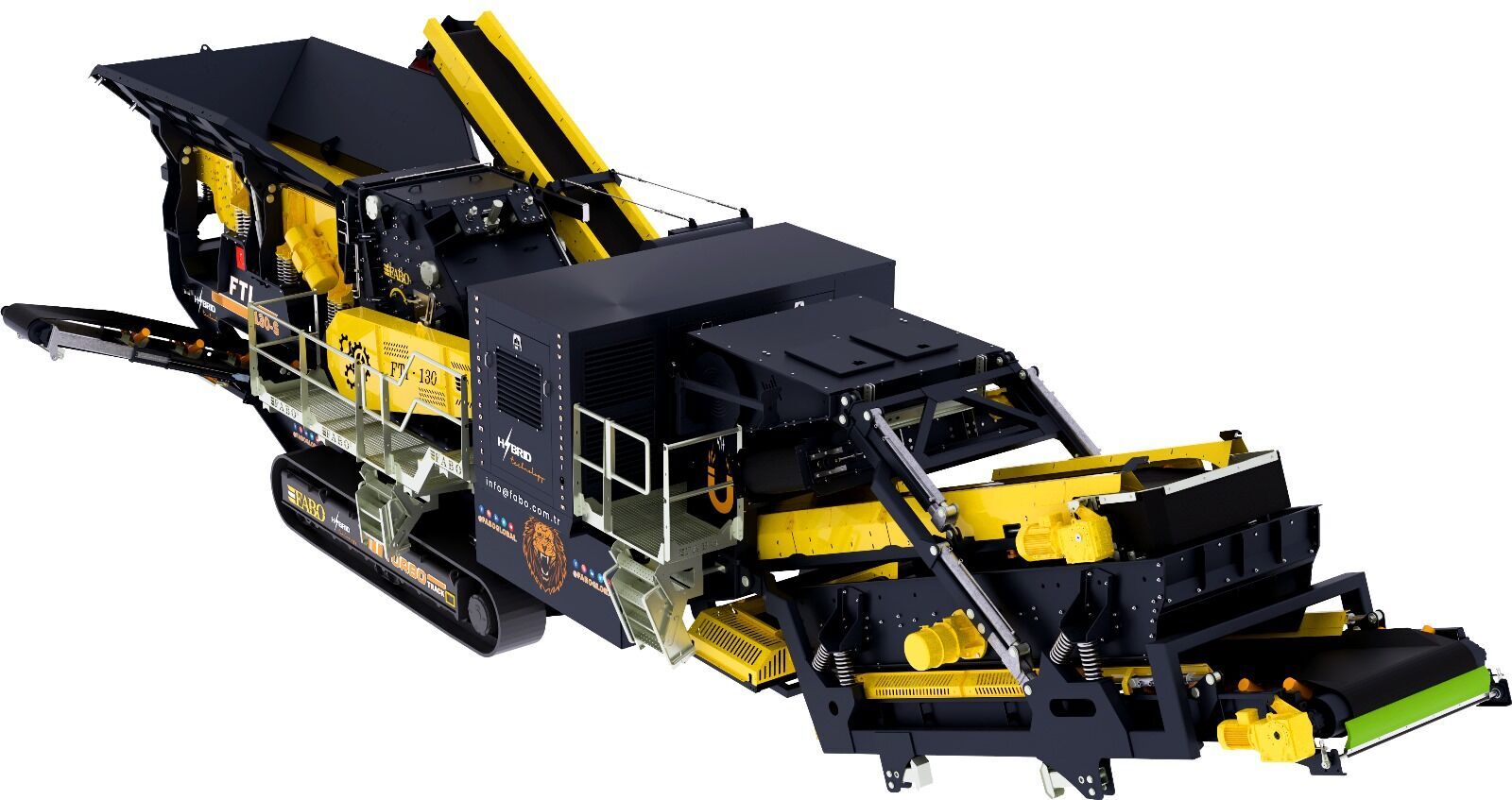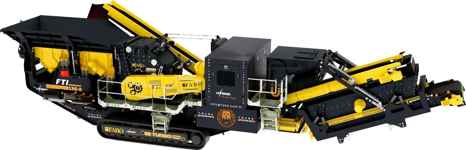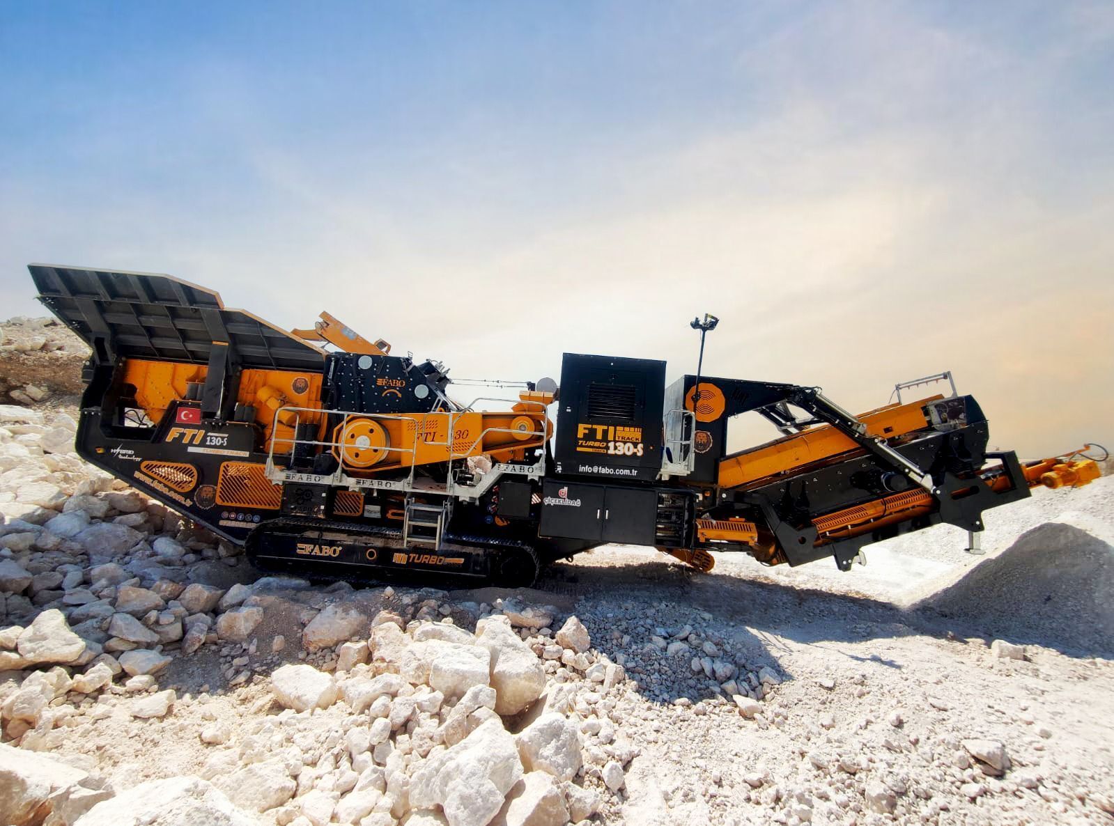 Fabo tracked impact crusher FTI-130s is a complete mobile system which moves on hydraulicly driven tracked system with 1 km/h speed and combination of a vibrated grizzly feeder, an Impact crusher, foldable stockpile conveyors, control unit and electric generator.