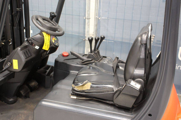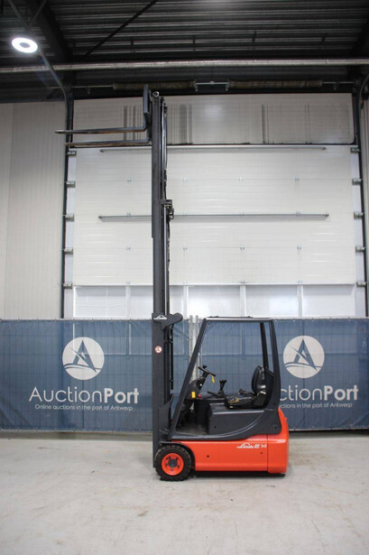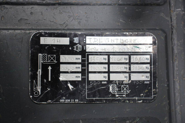 Brand: Linde Type: E14 Serial number: 000 938 21 69 Year of construction: Not known Fuel: Electric Mast type: Triplex Sideshift: Yes Lifting capacity: 1400 kg Lifting height: 4400 mm Operating hours read: 7021 h Tires: Solid tires Color: orange