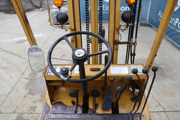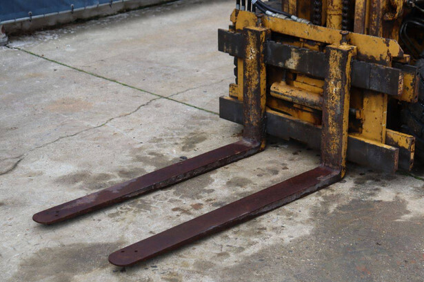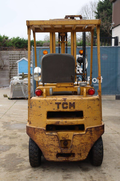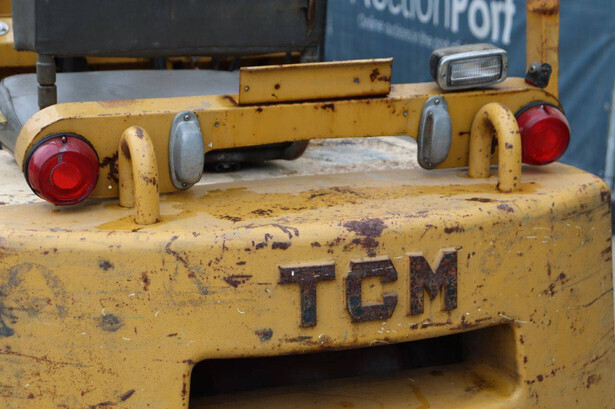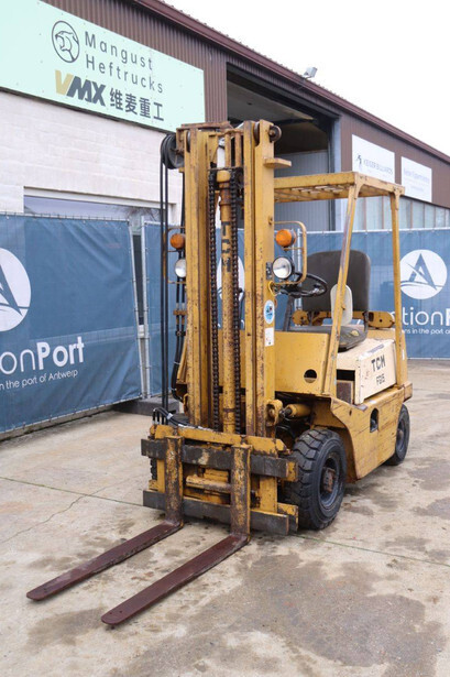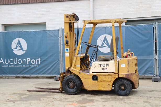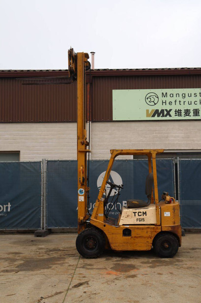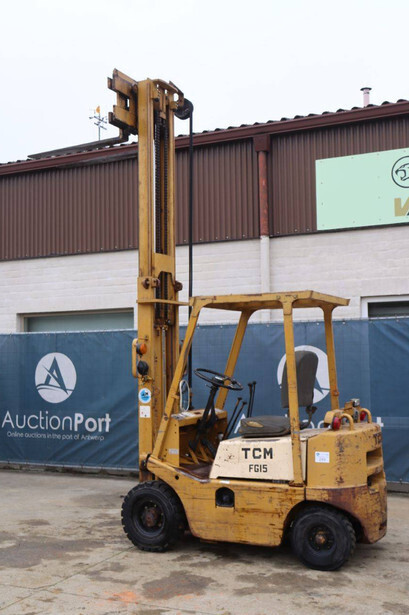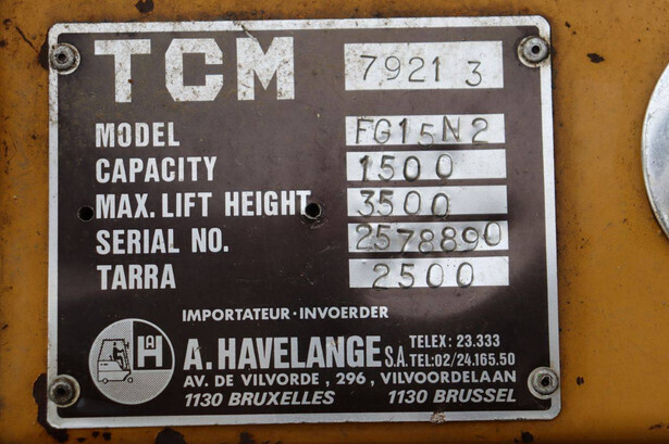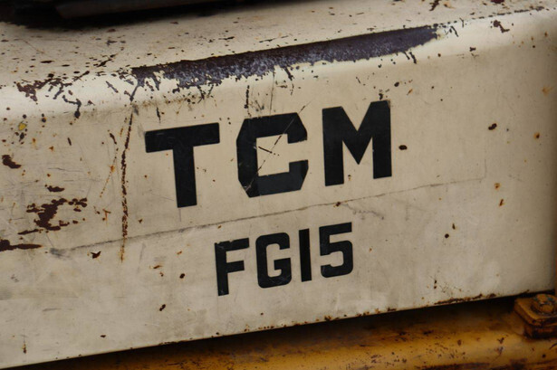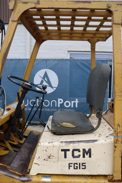 Brand: TCM Type: FG15N2 Serial number: 2578890 Year of construction: Not known Fuel: Diesel Mast type: Duplex Sideshift: No Lifting capacity: 1500 kg Lifting height: 4000 mm Operating hours read: 4573 h Machine weight: 2500 kg Tires: Solid tires Color: yellow